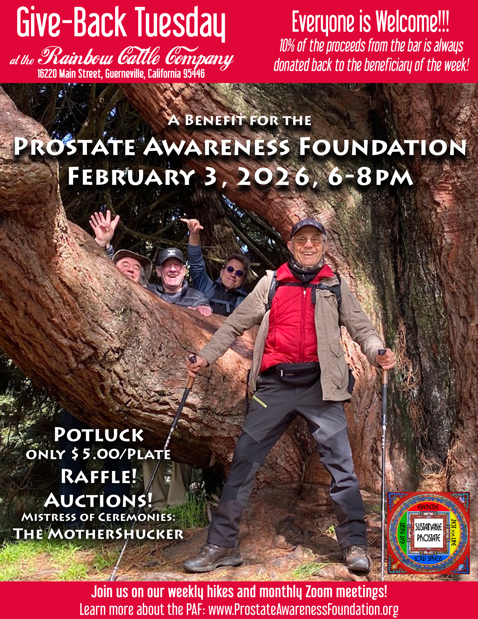 The Prostate Awareness Foundation (PAF) offers information, support, and education about the treatment options available to those with prostate concerns. The object is to lessen the trauma, impact, problems, and depression associated with the disease and to encourage proactive responsibility for one’s own healing. We also offer information to those who wish to take a preventative approach to the disease. Based in Santa Rosa, CA, we have been providing this service, nationwide since 1995.